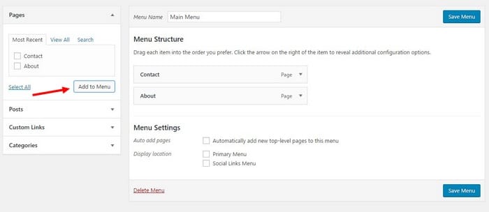 2. Ajoutez vos pages, catégories ou liens personnalisés depuis la barre latérale. Si vous manquez encore de contenu, vous pourrez y revenir plus tard.