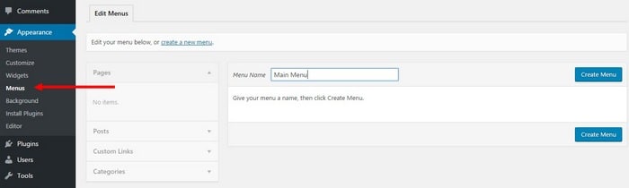 1. Dans le tableau de bord, allez dans Apparence > Menus et créez un nouveau menu.