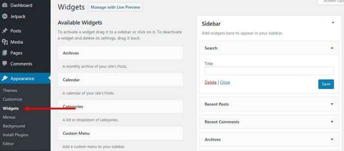 Si votre thème propose une barre latérale, rendez-vous sur Apparence > Widgets pour ajouter ou retirer les éléments selon vos besoins.